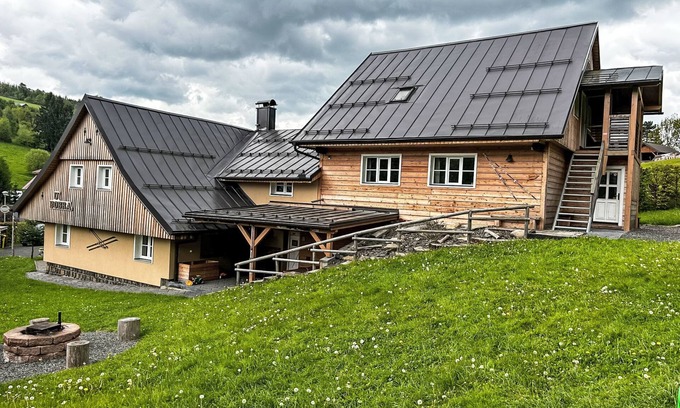 Very beautiful country house "Chalupa U Bobra", 2 storeys, detached. 2 apartments in the property. In a quiet, sunny position, 500 m from the edge of the forest, 1.3 km from the skiing area, 1.7 km from the river, 10 m from the stream. For shared use: property. Patio, barbecue, fireplace, children's playground (slide, swing). In the house: WiFi, sauna (extra). Playroom, table football, storage room for bicycles, storage room for skis, central heating system. Parking at the house. Grocery 500 m, supermarket 1 km, restaurant 800 m, bus stop "Rokytnice nad Jizerou, nám." 1 km, outdoor swimming pool 4 km, indoor swimming pool 20 km. Golf course (9 hole) 15 km, tennis 2 km, minigolf 8 km, walking paths from the house 10 m, cycle lane 300 m, ski lift 1.3 km, chair lift 1.3 km, slopes 1.3 km, ski rental 1.3 km, ski school 1.3 km, cross country ski track 1.3 km, children's playground 1 km. Nearby attractions: Huťský vodopád 5 km, Harrachov - sklárna, minipivovar, Mumlavský vodopád, bobová dráha 14 km, Příchovice, Kořenov, Jizerka 15 km, Jilemnice, Szklarska Poręba 20 km, Zoo, Aquapark Babylon Liberec 40 km. Well-known ski regions can easily be reached: Rokytnice nad Jizerou 3 km, Paseky na Jizerou 7 km, Harrachov, Vítkovice 13 km. Well-known lakes can easily be reached: Vodní nádrž Souš 20 km. Hiking paths: Okolo Rokytnice 500 m, Pašerácká stezka 2 km, Krakonošova cesta 5 km. Please note: suitable for families, suitable for seniors baby equipment on request (included). The sauna is accessible from the outside, it is for 8 guests. Sauna is available in the period 1.11.-30.4. (for free), in the period 1.5.-31.10. is on request (and for an extra charge).