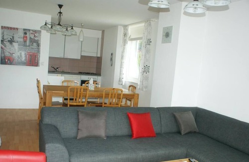 5 minutes from the cable cars and near the centre, modern apartment house. Apartment with 4 ½ rooms for max 10 people, about 84m2, 5th floor with elevator, nice, light and sunny, very nice view, including:Entrance hall with built-in wardrobe1 separate WC1 bedrooms with 3 single beds1 bedroom with 2 single beds and a sofa bed1 bedroom with double bed 160cm1 bathroom with bathtubOpen kitchen, well-equipped (fridge, gas cooker, oven, dishwasher, coffee machine, fettle, microwave, etc.)Living room with sofa bed, television with flat screen, dining cornerBalcony1 walk-in storage room on the landing with fridge-freezerSki room1 parking place outside (in front of building A)Laundry with washing machine and tumble-dryer (level 3)Non-smoking apartment -- Included in basic price:Electricity and heating1 outside parking lotExtra charges (obligatory):Cleaning package: CHF 270.-. (A supplement shall be charged in the case of excess)Tourist Tax: CHF 3.80 per adult/night, CHF 1.90 per child/night, CHF 1.90 per Senior/nightArrival outside opening hours/day: between CHF 50 and CHF 100Deposit: CHF 300.- blocked on a credit card at the arrival. The amount will be release 14 days after the departure.To bringBath towels --