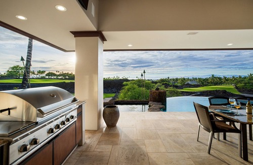 A covered lanai leads to an infinity-edge pool, elevated hot tub, and built-in barbecue station, all oriented toward the Pacific for postcard-worthy evenings. The manicured grounds are framed by lava rock and palms, offering peaceful seclusion with open-sky grandeur.