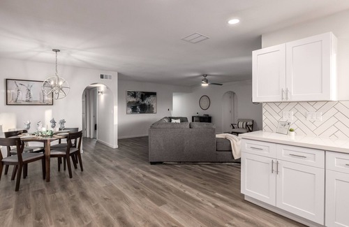 This home is a vacation just by itself! Family and Friends will enjoy this super modern and updated Chandler home with a HEATED POOL. That's right swim night and day and in this impressive backyard. Check out the swing dining table perfect for games and having a BBQ outside in the AZ warmth. This home is west facing so the views of the sunset are fantastic. When you step inside you will be in a great room that is perfect for everyone. A super sized 65" TV and sectional (also a full sized sleeper sofa) are the centerpiece. There is a bar for serving drinks and snacks. The open concept kitchen and dining area and great room will keep everyone in the action. The kitchen is well appointed and has everything you could possibly need for meal prep and entertaining. Indoor dining for 4 and outdoor dining for 8. The bedrooms are the very popular split floorpan. The Master to the south of the home has a king bed, large TV, massive closets and a ensuite bath with double sinks and a walk in shower. There is direct access to the backyard and pool from the master. The 2 additional bedrooms are on the other side of the house creating privacy, one being the 2nd king room and the other a luxurious queen both with 50" TV's. The hall bath is shared and has a tub and shower combo.