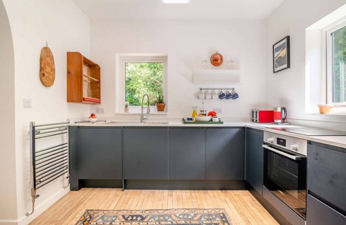 Modern kitchen with dishwasher, oven, induction hob, microwave, fridge/freezer, kettle, toaster and cafetiere