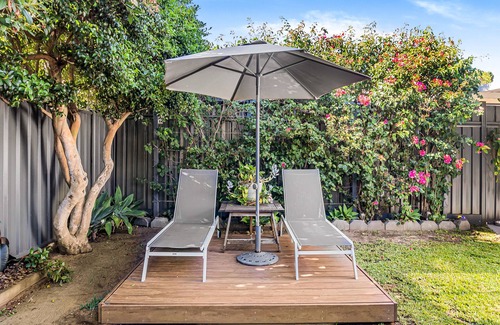 Private entertainment area with a BBQ, outdoor seating for 8 and two reclining chairs to soak up the morning sun. Nice garden area.