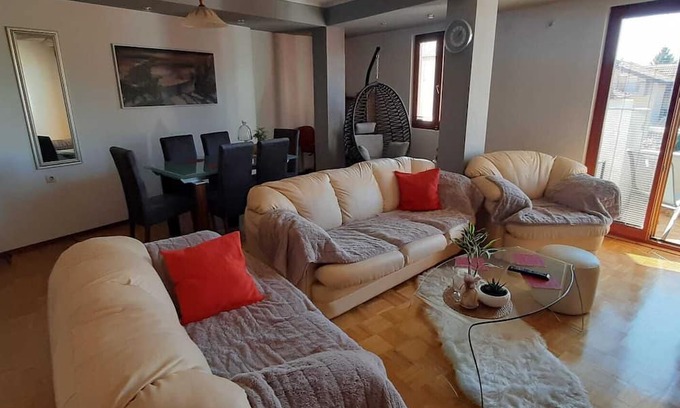 This Ohrid apartment boasts 1 inviting bedroom with a cozy king bed.Have large living room with 2 sofa beds and table with spot for work,also has nice dining room and all space is bright and light oriented east-south-west.There is also 2 balcony 1 at the living room and 1 at bedroom.The bathroom includes a bidet and hair dryer for your convenience. Enjoy the lovely amenities like WiFi, heating, and a washing machine during your stay. We're happy to assist with any questions while you stay at our apartment.This apartment is thermo and sound isolated.
