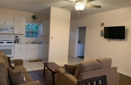 Experience St. John's Parish, Nevis like a local in this charming 1-bedroom apartment. This pleasant space offers AC, WiFi, an iron and iron board. Relax in the quaint bedroom and enjoy the peaceful surroundings. Sunshine Villa is a new very clean apartment with a cozy one bedroom, full kitchen, full dinning area, spacious living room, private bathroom, and washer all within a gated property.