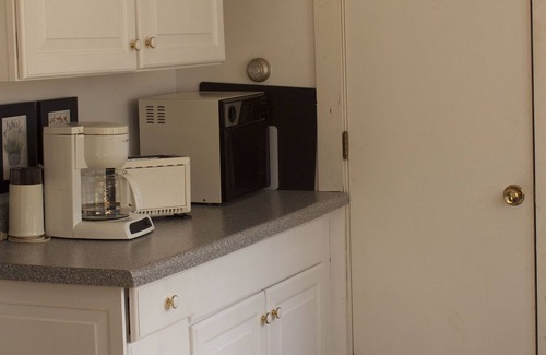 Our kitchen is compact but has all the pot, pans, dishes and utensils you might want. The dining area is attached with views of the woods. Great home base for biking, hiking or just poking around in the shops.