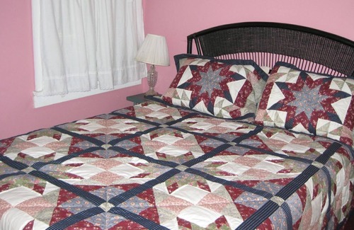 The bedroom has a queen-sized bed with plenty of pillows to prop yourself up to read a favorite book. There is a window AC unit. Sheets and towels are provided.