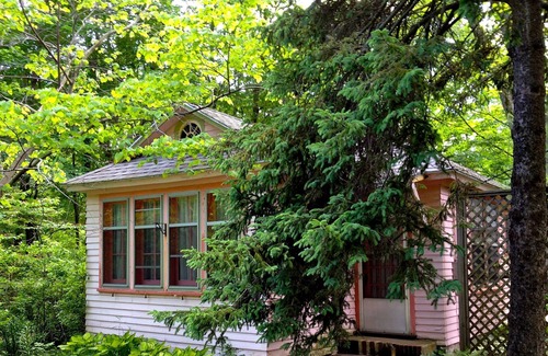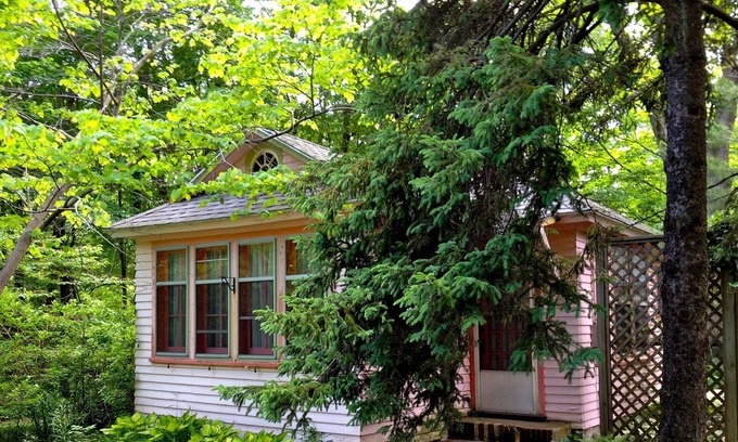 The cottage was built about 1930 and is set in a wooded area. Kitchen door opens onto the deck which is attached to a screened in gazebo. The gazebo is a perfect place for dining after sunset and chatting way into the night while being serenaded by crickets.