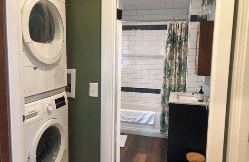 There is a modest bathroom with a tub shower, and vanity. There is a utility room with a stacking washer and dryer. Please turn washer water nobs off when not in use.
