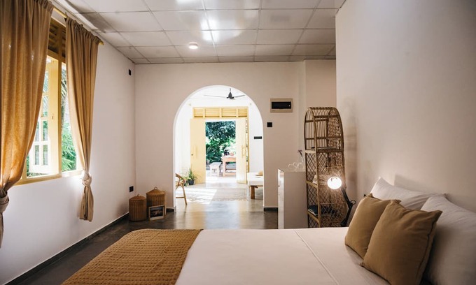 Located in Hiriketiya, this house is a dream. The cozy bedroom features a nice full bed, perfect for a good night's sleep. With WiFi and AC available, guests can stay connected and comfortable. The additional living room space offers a pleasant spot to relax or accommodate an extra guest on the large sofa that can be converted into a twin bed.