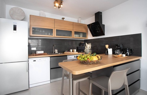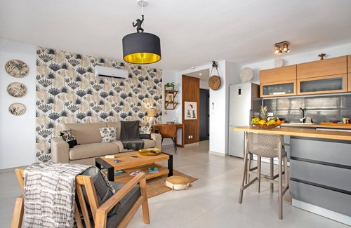 NEW for 4p Bellevue district All is new in this superb 1 bdr apt on the 1st floor (2nd floor for us people) of a small building in a secure residence in front of the lagoon swimming pool Large terrace, amazing view sunset Living room with convertible sofa for 2p, connected TV, fully equipped kitchen Modular room with a choice of 2 single beds or a king size bed. Connected TV. Small balcony. Bathroom with shower. Separate WC Wifi, A/C, parking stores within walking distance close to town center