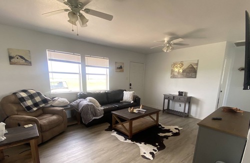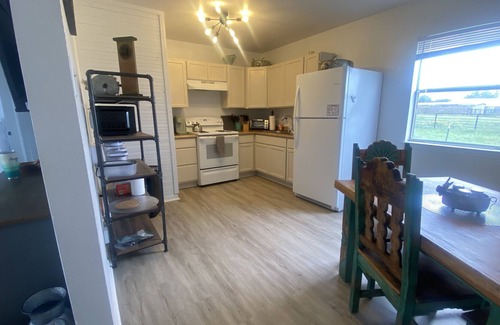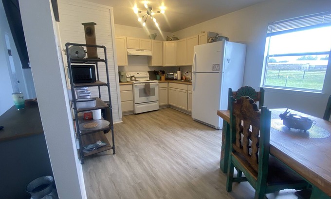 Welcome to the Cowboy Capital of Texas! Enjoy Texas farm views in this rustic 2 bedroom / 1 bath bunk house. Wake up to coffee and watch cattle and pigs grazing, maybe even a chicken or deer will wander into the yard. Home is situated on a 50 acre ranch tucked in behind the barns with amazing views of Texas sunsets. Enjoy stargazing around a camp fire. Located just 5 miles from town, you have easy access to all Stephenville has to offer. Additionally it is located approximately 20 minutes from wine tasting in historic Hico or less than 30 minutes from walking in Dinosaur tracks in Glen Rose. Note: Home is a rehabbed cowboy bunk house the floors aren't perfect and it still has signs of years of love.