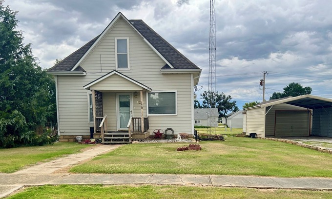 A cozy two story house located in Lucas, Kansas, the Grassroots Art Capital of Kansas. It is one block from the Garden of Eden and walking distance to the Grassroots Art center and Switchgrass Art Gallery. Eight miles away is Wilson Lake recreational area with plenty of hiking, biking, fishing, boating and swimming opportunities.