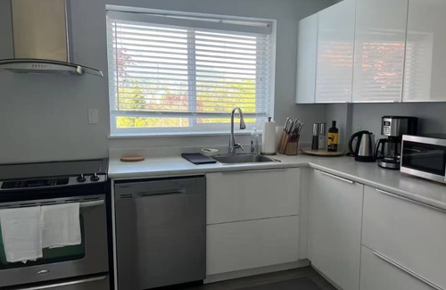 Renovated 2-bedroom one bathroom walkout basement suite in Port Moody. An 8-minute walk to Inlet Skytrain, providing a 40-minute commute to downtown Vancouver. It's also a 40-minute drive to Vancouver, subject to traffic conditions. Located near the picturesque New Port Village, Rocky Point Park, shops, and restaurants. The suite features a separate entrance with mountain views, queen beds in each room, a fully equipped kitchen, a 50" smart TV with Netflix, and free street parking.