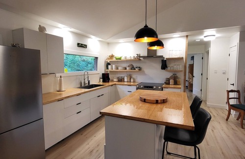This cute house offers 2 bedrooms equipped with ceiling fans: one with king and one with queen bed, perfect for a serene getaway. With amenities like AC, WiFi, washer & dryer, and a fire pit guests can relax and unwind. The bathroom comes equipped with a hair dryer, towels and basic toiletries for added convenience. Enjoy all that Grande-Digue has to offer when you stay at our place that is less than a 5 minute walk from the beautiful beach.