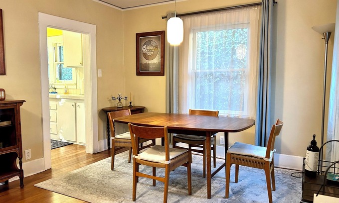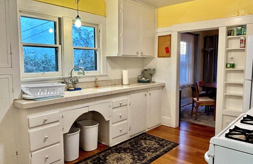 From the sun porch off the master bedroom you have views of the Hollywood Sign and Griffith Park Observatory. Imagine sitting here to enjoy each evening sunset as you tap away on your laptop. Built in 1923 and bursting with vintage details, this street level (but upper floor) apartment is 2 blocks from all of the restaurants and boutiques of Sunset Junction. Charming, a little eclectic and right in the heart of Silver Lake, it has all the comforts you want: fast wifi, washer/dryer, full dining room set up, good sized kitchen and full bath. If you appreciate design, you will enjoy discovering all of the little vintage touches, such as the antique doorknobs-turned-coat rack, the suitcase end table, and the french iron bistro table.