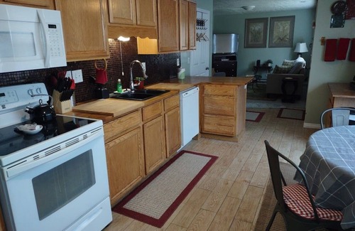 Updated kitchen with beautiful oak kitchen counters and glass tile with oak cabinets and full size appliances. Fully stocked kitchen with microwave, coffee maker, toaster, cookware, bake ware and more than you'll likely ever need.