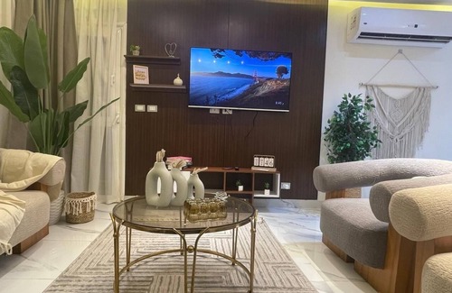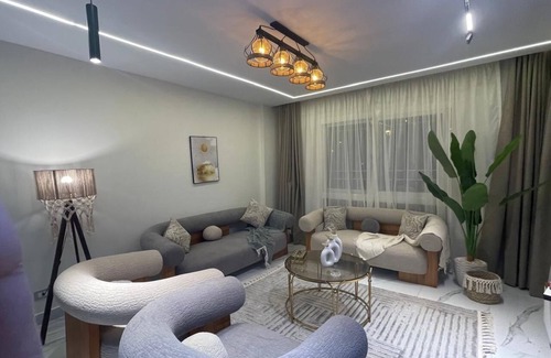 We offer you the highest level of luxury in the apartment as it contains all means of living. The apartment is fully air-conditioned and the furniture is completely new. A dining table that can accommodate up to 6 people. A fully equipped kitchen with a refrigerator, stove, oven, microwave, automatic washing machine and iron. The apartment consists of 3 rooms and two bathrooms, including a master bedroom with a private bathroom