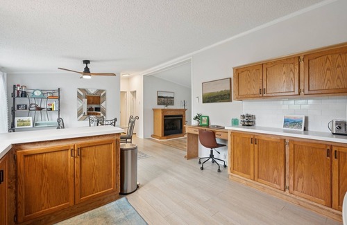 The space boasts a cozy retreat with three bedrooms and two bathrooms. It comfortably accommodates six guests and up to eight with an air mattress.