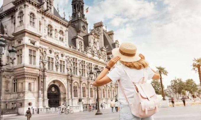 The open living area is designed for relaxation and socializing, featuring comfortable seating and large windows that provide a stunning view of a historic hôtel particulier. The tasteful interior design blends modern comforts with classic Parisian charm, ensuring a memorable stay.