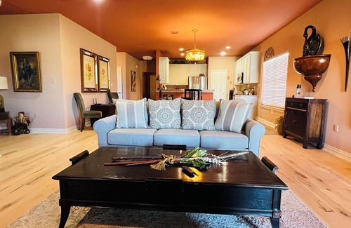 The 2 bathrooms come equipped with everything you need for a hassle free stay. The master bathroom has a stand up shower and a beautiful soaker tub. Open kitchen plan, a living room and an extra sitting area that can be used to visit or a quiet place to read. A nice outside sitting area to appreciate the views and relax. This property doesn't allow inside pets, but we do offer space for horses if needed. We think our place will help you experience everything Whitesboro has to offer.