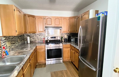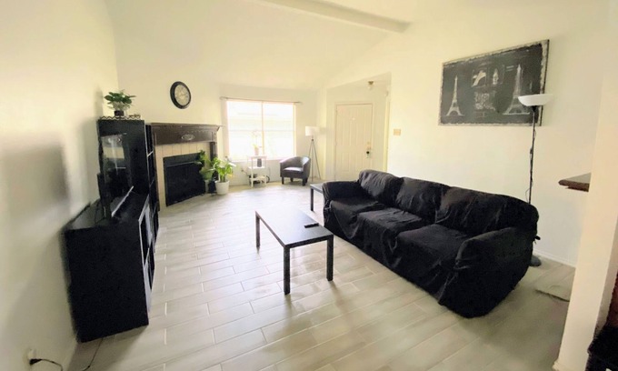 Beautiful charming home 10 min from the Domain. The house has beautiful tile floors and an amazing wood-grain fireplace. Enjoy the bright sunlight as you lay in and relax on our comfy beds or our cozy couch.