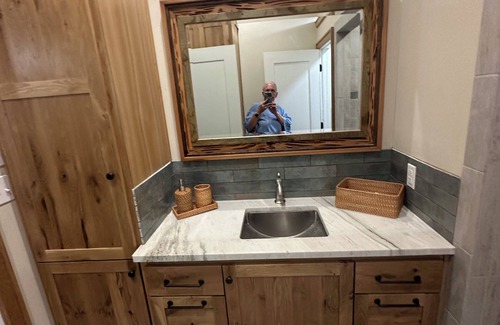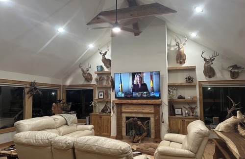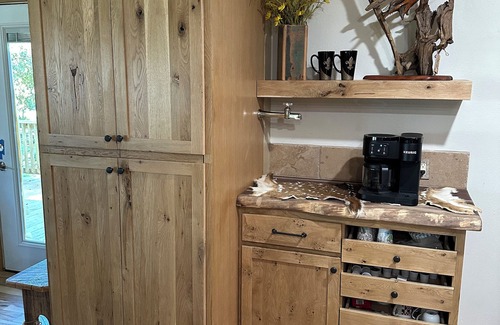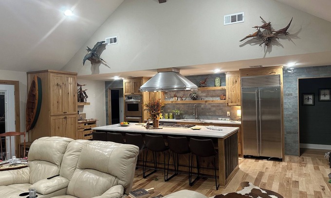 Dreaming of a retreat in the woods to unplug, relax, recharge and connect with nature? This modern cabin offers the space and upgrades ideal for gathering friends and family. Located just off the banks of Lake D'Arbonne in Farmerville, 7 minutes off Hwy 33 and 20 minutes from Historic Ruston, hometown of the Louisiana Tech Bulldogs, this home will serve up tranquility alongside the ability to have some unique experiences, visiting the restaurants, shops and local festivities happening in the surrounding areas. Enjoy a peaceful escape from the everyday noise on the spacious outdoor deck. Bring your boat, drop a line, and lose all sense of time. Utilize the amazing kitchen appliances to cook up some mouth watering fun. Spread out with your favorite people in the open living area with provided games and streaming available. The options are endless in the gorgeous lakeside retreat, unlike any in the area with sleeping capabilities of 8+, a large dining table to share meals around with seating for 8/10, kitchen essentials, a Viking 48" gas 6 burner cooktop with grill, Jennair double oven, side by side SubZero refrigerator, a coffee maker (keuric cups or by the pot), KitchenAid dishwasher, a washer/dryer, extra linens, multiple TV's, WIFI, views of the lake, and much more! 3 Bedrooms, 2 Full Bathrooms, Master Bedroom boasts ensuite bathroom with tub/shower along with mounted television. Other two bedrooms are furnished with two full size beds with twin size loft beds overhead, sleeping 3 people/room if desired. Ceiling fans, lamp lighting and storage options in each bedroom. Expansive kitchen island offering bar seating for 6. Comfortable leather seating options in the main living area, including options to recline while watching the 72" TV by the cozy fireplace. Wood flooring throughout the main living areas and 2 bedrooms. Give yourself this gift and reserve some nights making your next getaway a reality, in this remarkable rental!