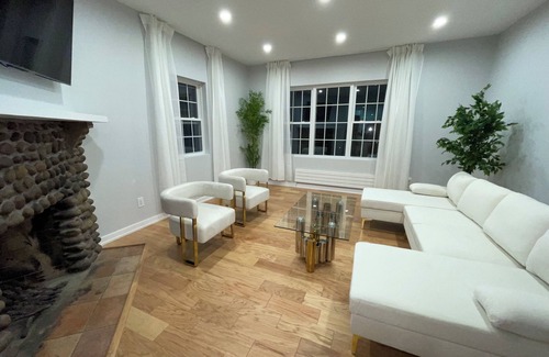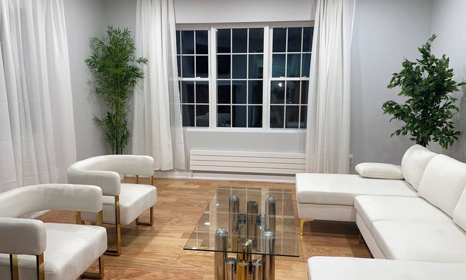 Discover an oasis of comfort and style with free parking—an uncommon perk so close to NYC. Located just 20 minutes from downtown and steps from the subway, this modern getaway strikes the perfect balance between city access and peaceful retreat. The home features expansive living areas, plush furnishings, beautiful hardwood floors, and all the modern comforts you need.