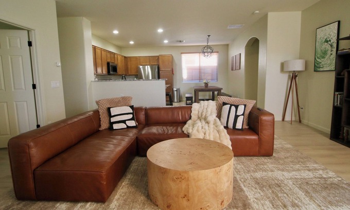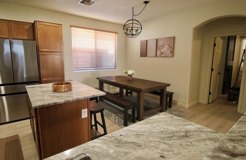 The kitchen is chef ready, fully equipped to cook healthy meals including an Instant Pot, air fryer, Keurig, and all essentials.. Newly updated with granite countertops, wood floors, and mid-century modern interior design. The dining area seats 8 — perfect for entertaining or meetings. The living room boasts a large, comfortable leather couch with a 65" smart TV and built in surround audio. Fast WiFi is included throughout. The backyard is resort style. Relax or host with your private pool and hot tub, outdoor dining, grill, and pool toys—a true desert retreat. Garage has 2 parking spaces and a dedicated level 2 plug for electric vehicles. Located minutes from White Tank Mountain hiking trails and stunning sunsets. 10 minutes to major shopping & dining: Target, Costco, Walmart, and more. Near top-rated hospitals, medical centers, and growing tech corridors. Compared to local Phoenix and surrounding cities, Waddell is a hidden gem in the West Valley, Waddell offers a quiet, family-friendly atmosphere with quick access to major freeways, Luke AFB, Goodyear, Glendale, and Surprise, and a booming healthcare and tech sector—ideal for winter travelers, military families, corporate travelers, healthcare professionals, and relocating families.
