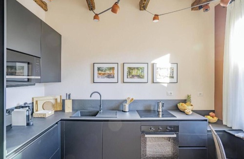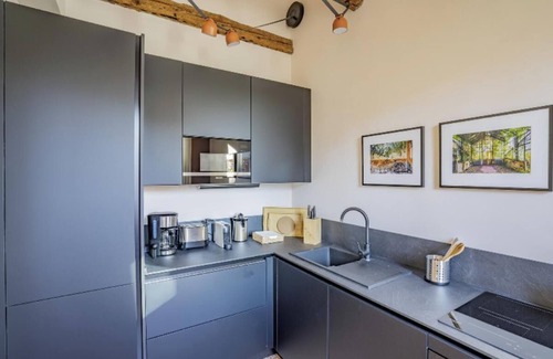 This apartment has contemporary-style living space overlooking the campo and comprising a beamed sitting / dining area and a semi-separate u-shape kitchen. Cheerfully decked out to delight in toasty burnt oranges and cool graphite greys and benefitting from 4 windows (2 at either end) drawing light into the room, the space is furnished with a pair of stylish sofas, tub chairs and a dining suite hosting 6 guests, while the modern, compact yet well-equipped kitchen to the side has a breakfast bar seating 2 for a quick bite ‘on the hoof’ while taking in the view!