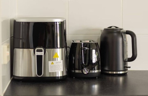 Fully equipped kitchen equipped with quality appliances: fridge, toaster, kettle, oven, microwave, airfryer & dishwasher.