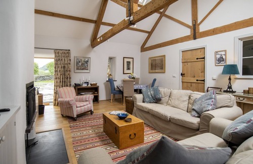 Y Boncyn is an award winning, charming,and detached two bedroom, two bathroom cottage with eco friendly wood fired hot tub in a secluded location.. The cottage is hidden among private woodlands just minutes away from Black Rock Sands and lovely Criccieth. With only a herd of curious sheep for neighbours, we promise the perfect get away from it all holiday. The living room with oak underfloor heating and wood burning stove has full height beamed ceilings and French Windows onto the gardens. The well equipped kitchen has everything that you could possibly need. Bedroom one with king size bed has a en-suite bathroom with bath, shower cubicle, sink and loo. Windows look across the gardens. There is a downstairs loo. Upstairs, under the eaves, is bedroom two with singles that zip together to make a king and en-suite bathroom with bath (with shower over), sink and loo.