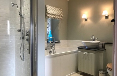 To the front of the cottage is a large, walled and lawned garden with eco friendly wood fired hot tub and parking area. This is a beautiful cottage where colours are serene, fabrics are fresh and paintings and furniture (old and new) add to both its character and style. We offer superfast wifi.