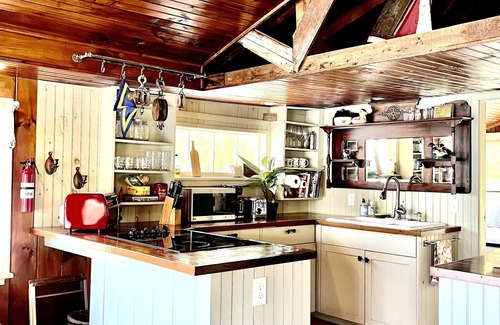 The boathouse has two rooms. The main cabin has a kitchen with a four burner stove top, double-sink, microwave, coffee maker and small refrigerator. In the living room area there is a kitchen table, cozy sofa, and La-Z-boy recliner. Double glass doors open to a 12' x 12' deck that is directly over the pond. The bathroom is small and quaint. The bedroom has a queen-size bed and a daybed. The boathouse is located on shared property with the main house that is occupied by the owners. The boathouse is down at the water, and the main house is up the hill 100 ft away and is separated by a privet hedge.