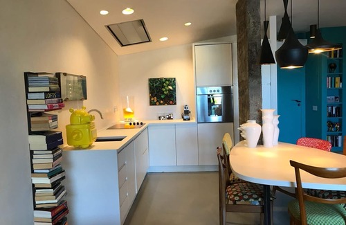 - kitchen with fridge, oven, dish washer, ice machine, nespresso coffee machine, tableware and household utensils.