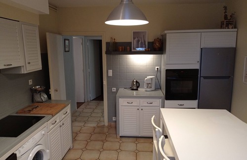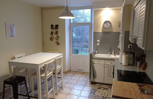 This large apartment is located on the first floor of a house of character. It consists of a veranda entrance where you can enjoy a summer lounge; this room opens onto the large living room and dining room. The fully equipped kitchen opens onto a balcony and terrace where you can enjoy your meals.