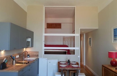 On stage, in an old Palace overlooking the sea and beach huts, playpen 37m2 apartment, sleeps 4. Magnificent sea views through a large window the apartment has high brightness, Apartment completely renovated with lots of charm fitted kitchen (microwave, stove, fridge, coffee maker, kettle, dishwasher ...), living room with New sofa and excellent bed, separate bedroom with a 140 bed, shower room. Television (DTT) Location possible mid-End Week or (2 night minimum).