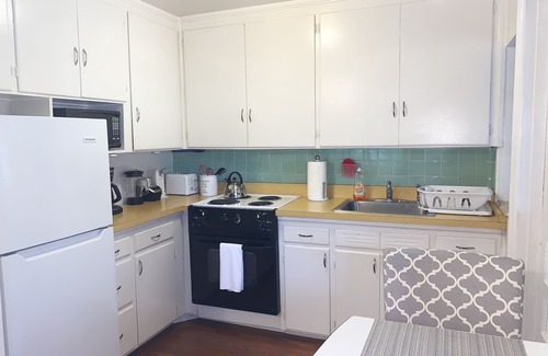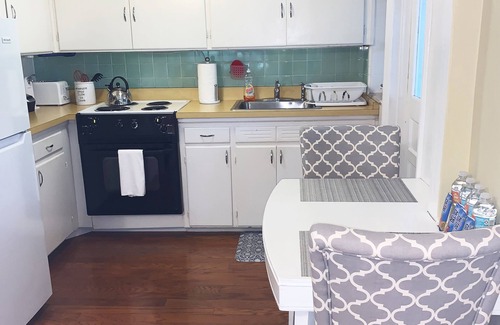 The apartment has hardwood floors, its own washer/dryer, a fully-equipped kitchen, two ceiling fans, two mini-split air conditioning/heating units, cable, Wi-Fi and its own dedicated off-street parking. It is on the second floor of a quiet 4-plex.