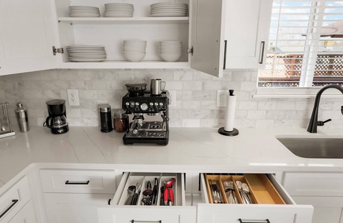 Fully Equipped Kitchen A chef’s dream with beautiful countertops, modern appliances, and an open-plan layout overlooking the living and dining areas. Enjoy your morning brew with the espresso machine or coffee maker and dine comfortably at the island or outdoor patio. Cozy Living Room Relax on the big sectional couch while watching movies on a 60” Smart TV or enjoy quality family time with games and books stored in the central ottoman.