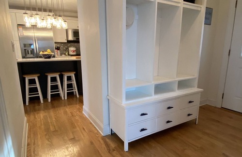 The first floor has amazing views of the water. On this floor you have a gorgeous fully-equipped kitchen with stainless steel appliances, dining area, and laundry closet, a big comfortable living room with TV and a kids craft table and a bar with an ice machine, and a small 1/2 bath. There is a big closet and entryway at the front which features a little porch and 2 chairs to enjoy your morning coffee outside. Off of the back of the house is a fenced-in deck that can be locked for child safety. The deck has two dining tables that can seat up to 12 people for outdoor dining on the water. Off the deck stairs is a patio with a fire pit and sitting area to enjoy a cocktail and the sunset every night. There is also an outdoor shower for an easy rinse after the beach or a long day in the sun. The garage has a second beverage fridge, beach cruisers with kid attachments, beach toys and chairs, and other fun water activities, such as a Kayak. Our dock and boat slip is available upon request if you wish to bring your boat for the stay!