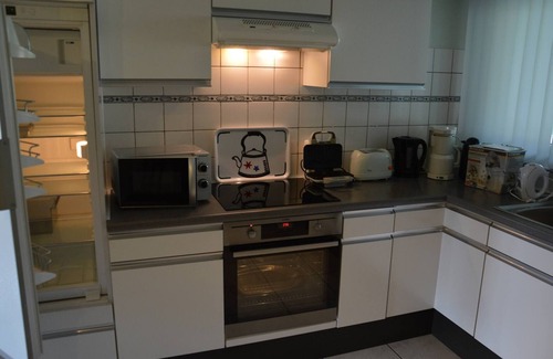 De ingerichte keuken beschikt over een koffiezet, waterkoker, broodrooster, croquepan, popcornmachine, microgolfoven, klassieke oven, 4 pits halogeenkookplaat, vaatwasser, frigo met kleine vriesruimte.