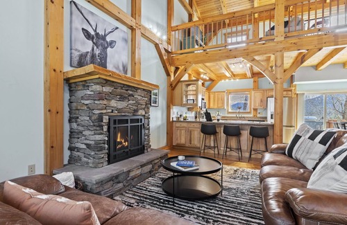 The main floor upper level including a luxurious master suite with a king-sized bed, en-suite bathroom. The second level has a balcony with panoramic mountain views, sitting area with a smart TV, full-sized pull-out bed. This level also boasts two other bedrooms, each with its own unique decor and charm. The one bedroom has a queen-sized bed with its own private balcony, and the third has two twin beds.