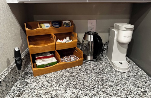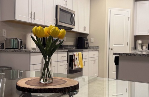 You and your family will be so comfortable in this home and community! Here are the highlights that your entire family can enjoy. QTY (2) TVs in this home. All new appliances, great A/C and central dehumidifier. This beautiful home looks out over a small pond. The primary bathroom has a beautiful queen bed and an attached bathroom with two sinks, a separate toilet room, a shower, and a walk-in closet with a pack and play. The second bedroom and the third bedroom both have beautiful, new queen beds and one TV. The fourth bedroom comes with a queen bed. There is a bathroom by these bedrooms with a bathtub and shower, a toilet, and two sinks. Beautiful clean carpeting, spotless tile in kitchen and main gathering area. Enjoy beautiful sunrises over the pond while you sit on your living room couches. Coffee pot and Keurig, microwave, dishwasher, ceramic top stove, oven and toaster. Beautiful granite counter tops in kitchen and bathrooms. Dining room table seats 6 and kitchen island has 3 additional chairs. Wash all your family's clothes in our spotless laundry room with brand new Whirlpool washer and dryer. Comes with laundry soap, shampoo/conditioner, hand soap, bar soap, ironing board, hair dryers and family games, puzzles, books and drawing supplies. The TVs will provide full access to these apps (Disney+, MAX, HULU), and the family room will provide many more options.