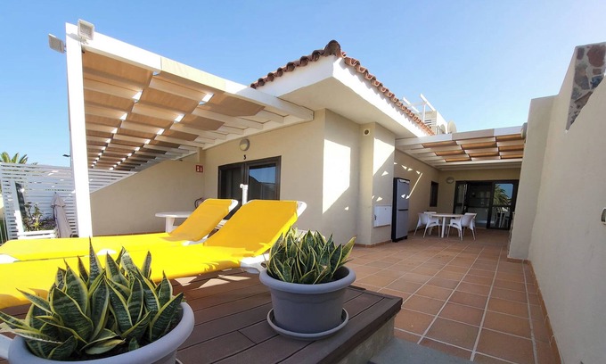 Make your memorable escapade to Bahía Terrace by Premium Bungalows Bahía Feliz in a picturesque location of Urbanización Bahía Feliz, San Bartolomé de Tirajana, Gran Canaria with a fascinating sea and mountain view.