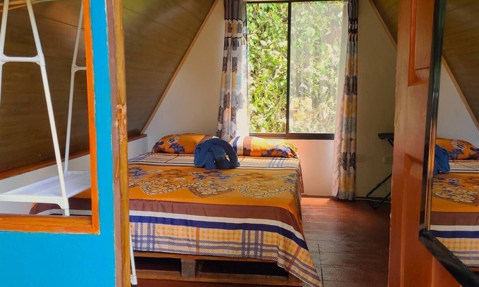 Our chalet includes a comfortable double bed with fresh linens, electricity outlets, and an inviting outdoor area surrounded by tropical greenery—ideal for unwinding after a day of adventure. A well-maintained shared bathroom adds to the sense of community while keeping your space cozy and affordable.