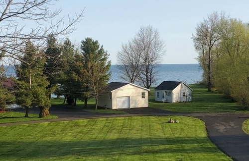 This four-season retreat features views of both Lake Ontario and Port Bay from the two-story deck with a secluded hot tub on the lower level. The upper level includes: A Paris-inspired dining and living area, an open concept kitchen with island and living room with wall to wall windows facing Lake Ontario. The lower level features: A lake-themed living room connected to the lower deck via sliding glass doors, and a spacious lower level master bedroom with adjoining sitting area. All of the rooms described above have seating options that offer reading nooks and/or lake views. This one-acre property is tree-lined on both sides, and fully backs to a wooded area. Located on a private drive, and 1,000 feet from the state boat launch site for Port Bay/Lake Ontario that shares a parking lot with the sandy beach along Lake Ontario. This immediate area is ideal for walking, boating, fishing, and endless solar eclipse footage opportunities. There is a point/look-out 500 feet from the house that offers breathtaking views of the Bluffs and sunsets, or view the sunset from the top deck.