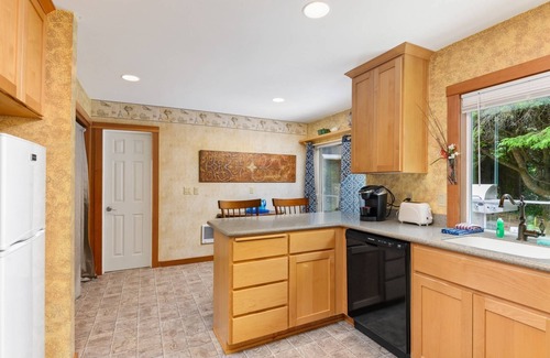 The full kitchen is stocked with all the equipment you'll need to make a delicious meal together, including a dishwasher, blender, and slow cooker. The living room is perfect for coming together - just turn on the electric fireplace and enjoy a movie on the big-screen TV. A musically inclined guest can plink out a tune on the electronic keyboard. There's plenty of comfortable seating for kicking back, and the wide row of windows will let in mellow coast sunlight. Play your favorite tunes on the CD player while you sip on coffee straight from the French press. Coastal vibes rule at this lovely home.