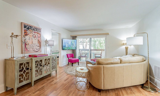 This gorgeously decorated unit offers everything you will need for your stay! 2 bedrooms/2 bathrooms, comfortably sleeping 4 guests with a perfectly situated split bedroom design, offering additional privacy to all guests, as well as convenient office desk for your business needs. Fully equipped kitchen, dining room, and living room. Sliding door will lead you out to a private covered balcony, perfect for enjoying outdoor meals or reading your favorite book. Feel at home with added features such as large screen TV’s in every room, cable, password protected WiFi, in unit laundry, walk-in closet and much more. Condo entrance is on the 2nd floor and has assigned covered parking.