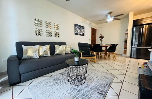 Welcome to our lovely two-bedroom apartment in a gated community with 24/7 security and electronic key entrance. The apartment features an outdoor pool and a prime location. Inside, you'll find a living-dining room, two bathrooms, 100 Mbps WIFI, a 55" SMART TV with an APP BOX, a full kitchen, and a parking spot. Each room is equipped with A/C and ceiling fans.