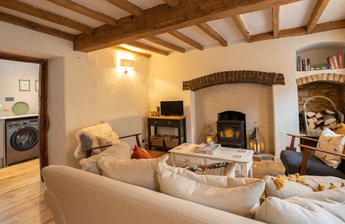 The entrance to the cottage leads into a large living room, set around a Scandinavian wood burner, with a large comfortable sofa and two armchairs. There is a smart TV.