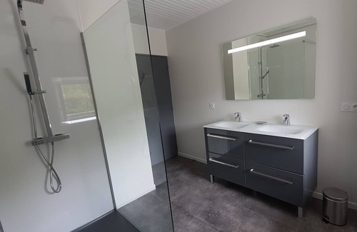 - a large living room of 50m2 with a fully equipped kitchen open to the dining room and a living room with fireplace.